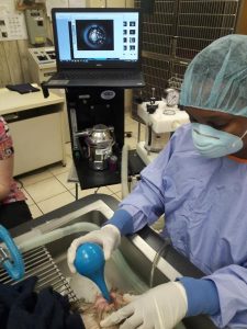 Ear flushing is an important part of clearing up an ear infection fast and effectively. The ear canals need to be irrigated with a warm antiseptic solution under anesthesia. Removing the debris will allow the medication to penetrate better. While irrigating the ears under sedation the eardrums will be examined with endoscopy to determine if the eardrum is damaged or swollen. Damage to the eardrums needs special attention. In order to control pain, swelling, and prevent hematomas (blood clots) in the ear, aggressive application of injectible and oral pain mediation is recommended.